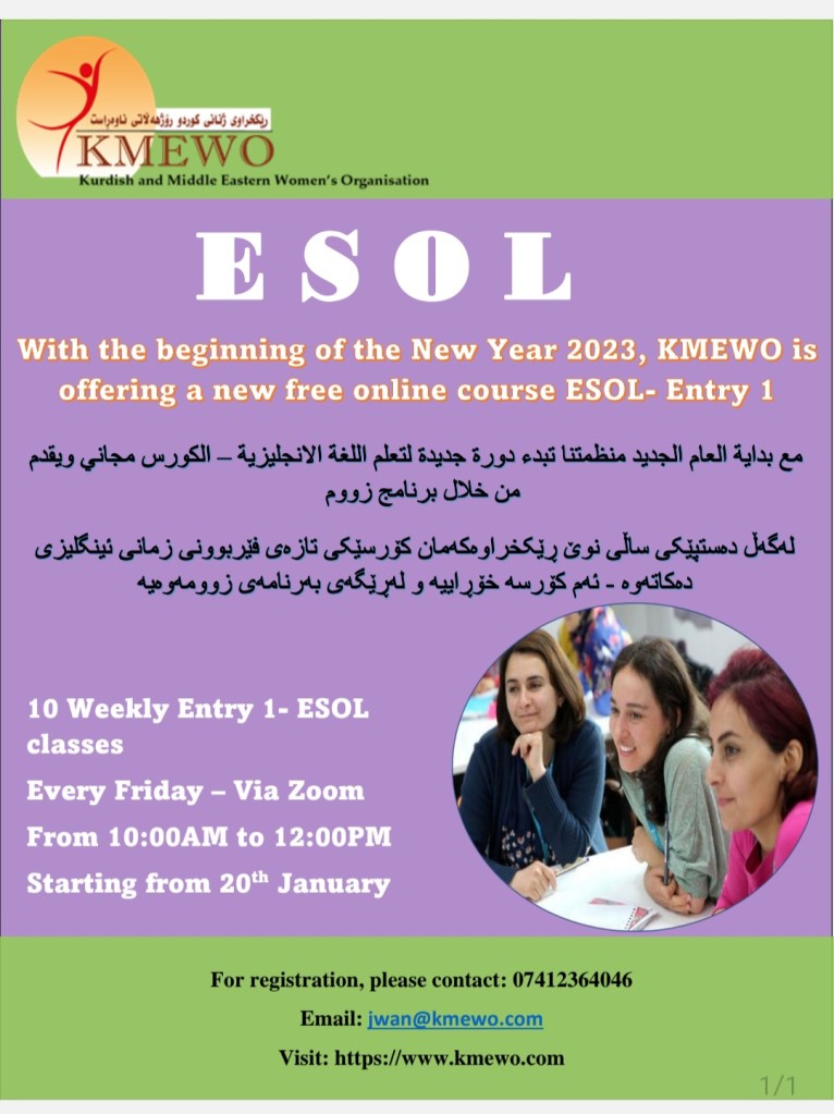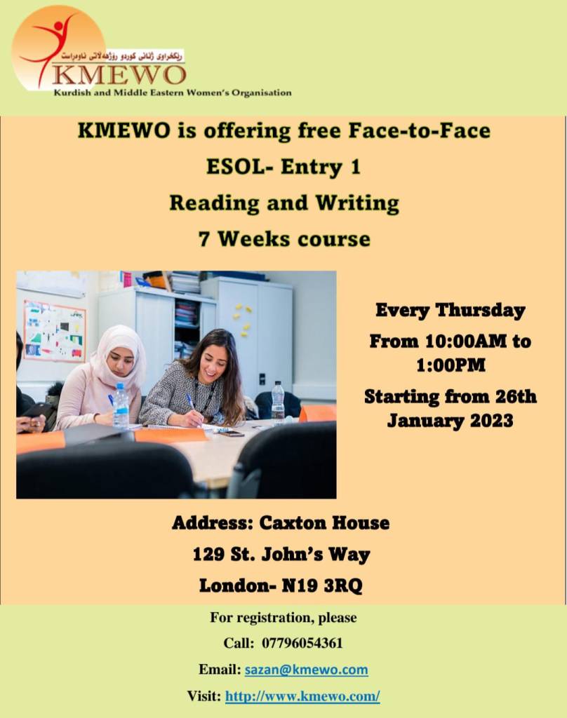 With the beginning of 2023, KMEWO is offering a series of successful ESOL courses. These are provided on Entry 1 Level and you can choose whether to attend online (Friday at 10AM) or in person (Thursday ay 10AM) at Caxton House, 129 St. John’s Way, London, N19 3RQ.
